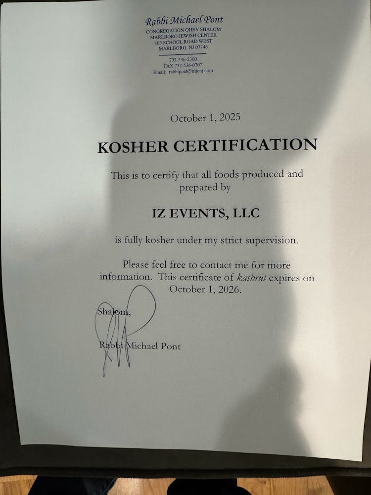 IZ Events is under the strict supervision of Rabbi Michael Pont of the Marlboro Jewish Center. Glatt Kosher supervision is available through collaboration with Park East Kosher under the Chof K supervision.