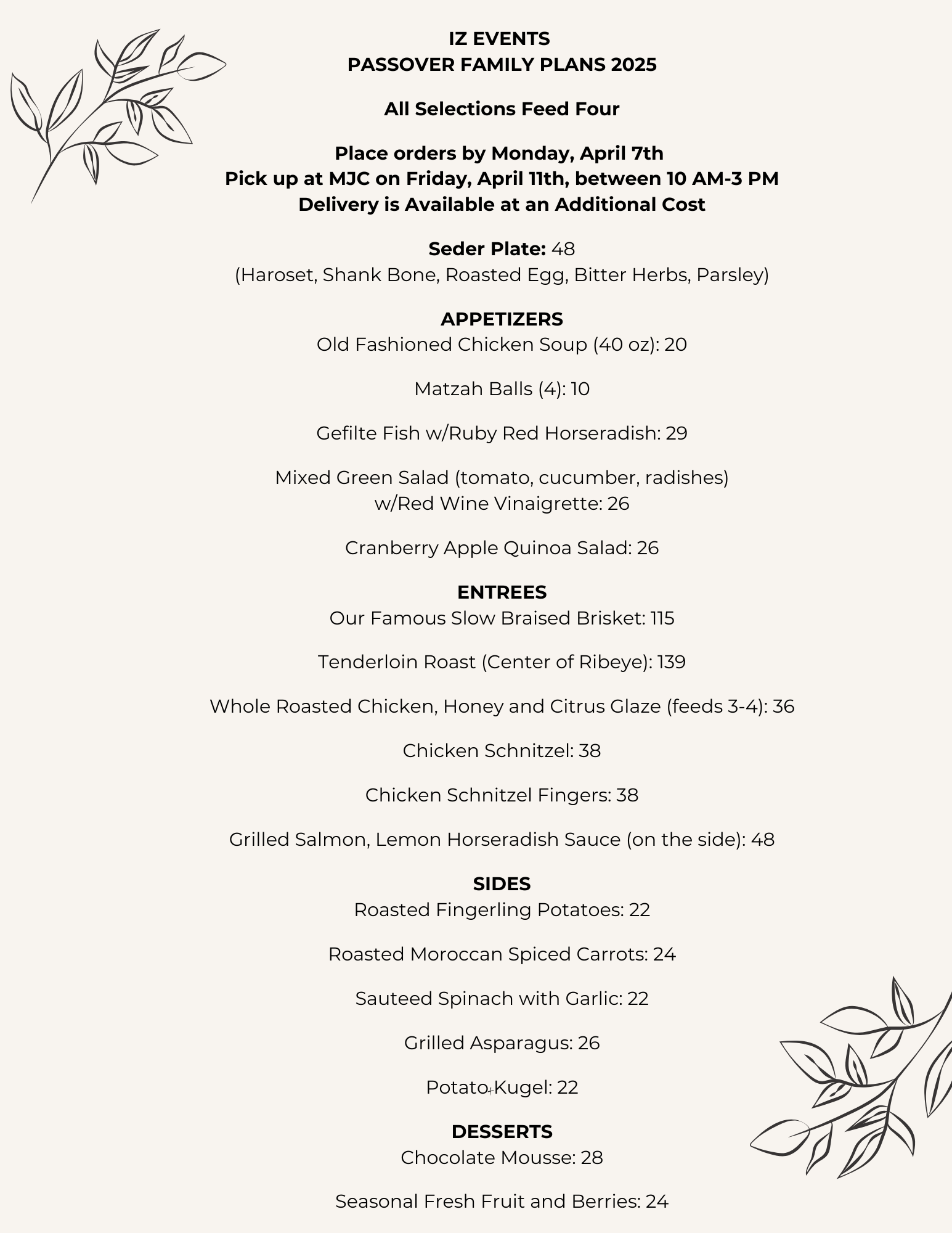 We will be catering two community Seders on Sunday, April 13th, at Marlboro Jewish Center and Forest Hills Jewish Center. Please get in touch with the synagogues directly for more information.